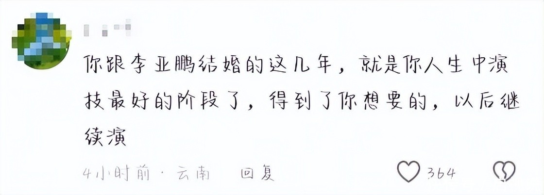 47. 然而评论区却充斥着阴阳怪气的声音,指责她过去几年与李亚鹏的婚姻生活是一场“精湛演技”的展示,劝她继续“表演”下去。